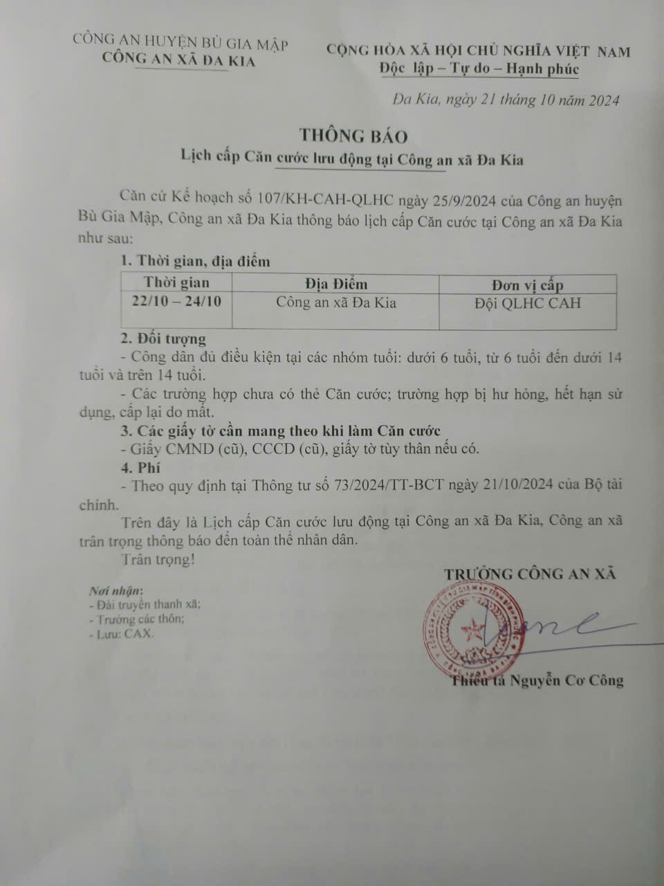 Công an xã Đa Kia thông báo lịch cấp Căn cước lưu động trên địa bàn xã Đa Kia