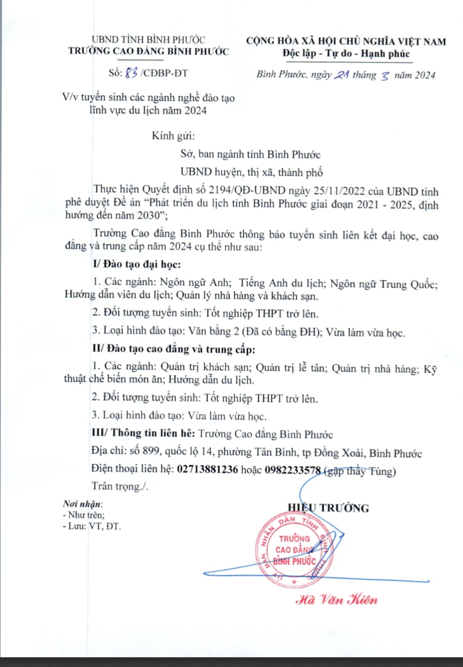 Ngày 21 tháng 3 năm 2024, Trường Cao đẳng Bình Phước ban hành thông báo tuyến dụng số: 83/CĐBP-ĐT về việc tuyển sinh nghành nghề đào tạo lĩnh vực du lịch năm 2024. Cụ thể nhu sau: