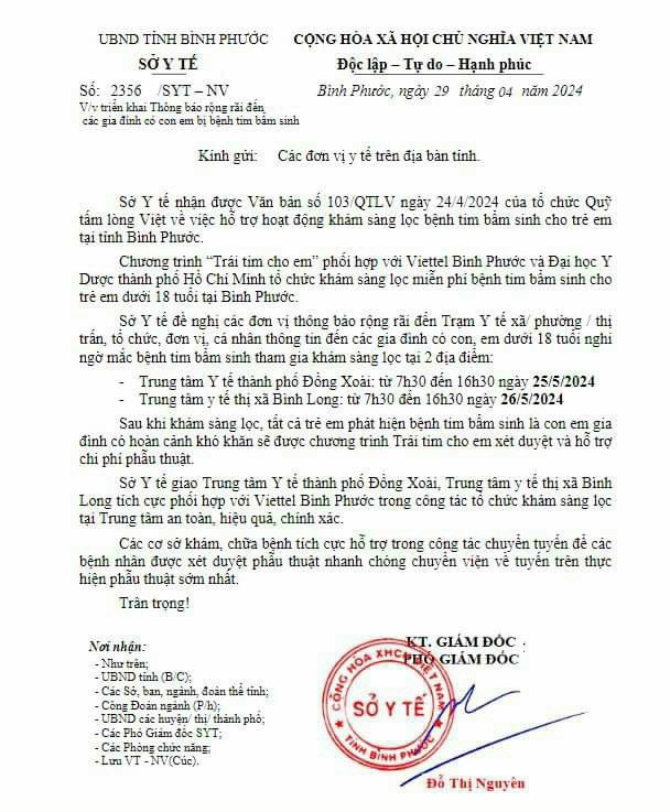 Ngày 03 tháng 4 năm 2024 UBND xã Đức Hạnh nhận công văn số: 20/SYT-NV ký ngày 29/4/2024 về việc triển khai, thông báo rộng rãi đến các gia đình có con bị bệnh tim bẩm sinh tại tỉnh Bình Phước.