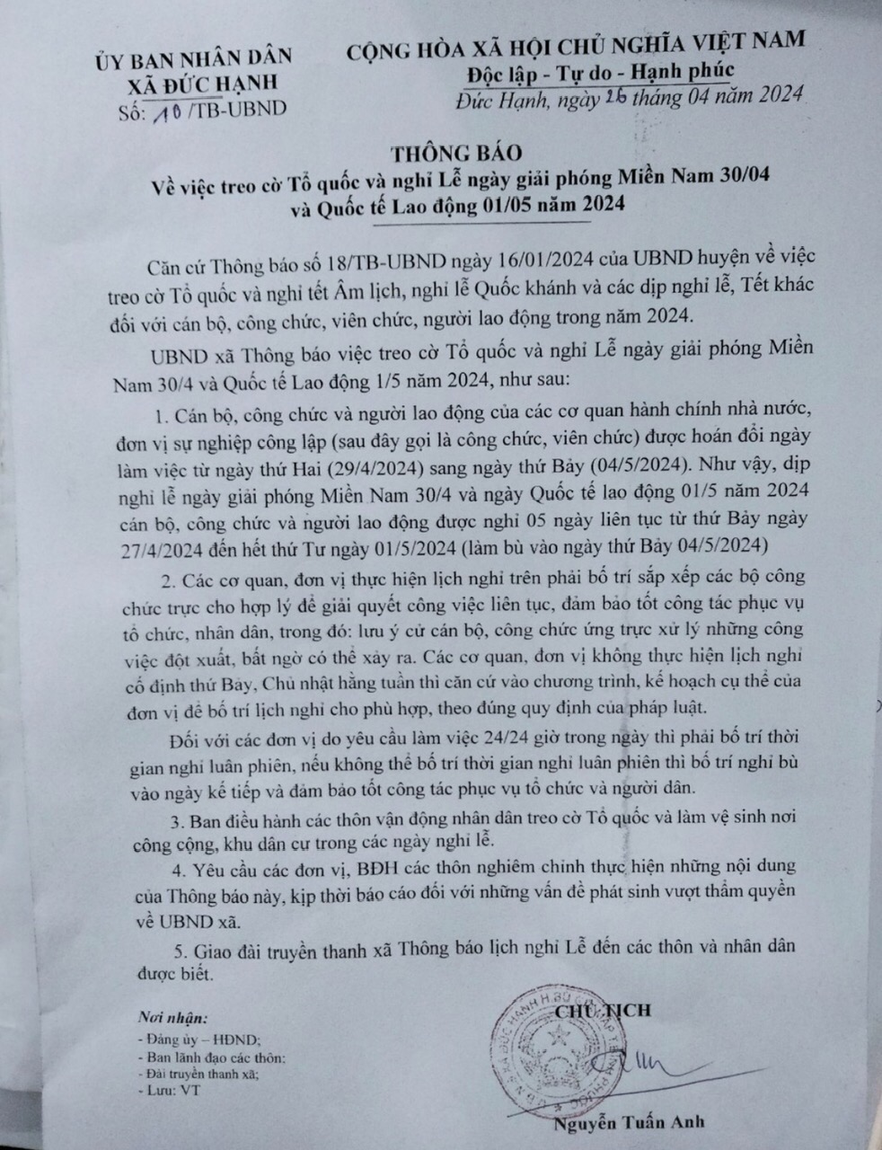 Ngày 26/10/2024 UBND xã Đức Hạnh ban hành Thông báo số: 10/TB-UBND về việc treo cờ Tổ quốc và nghỉ Lể giải phóng Miền Nam 30/4 và Quốc tế lao động 01/5 năm 2024.