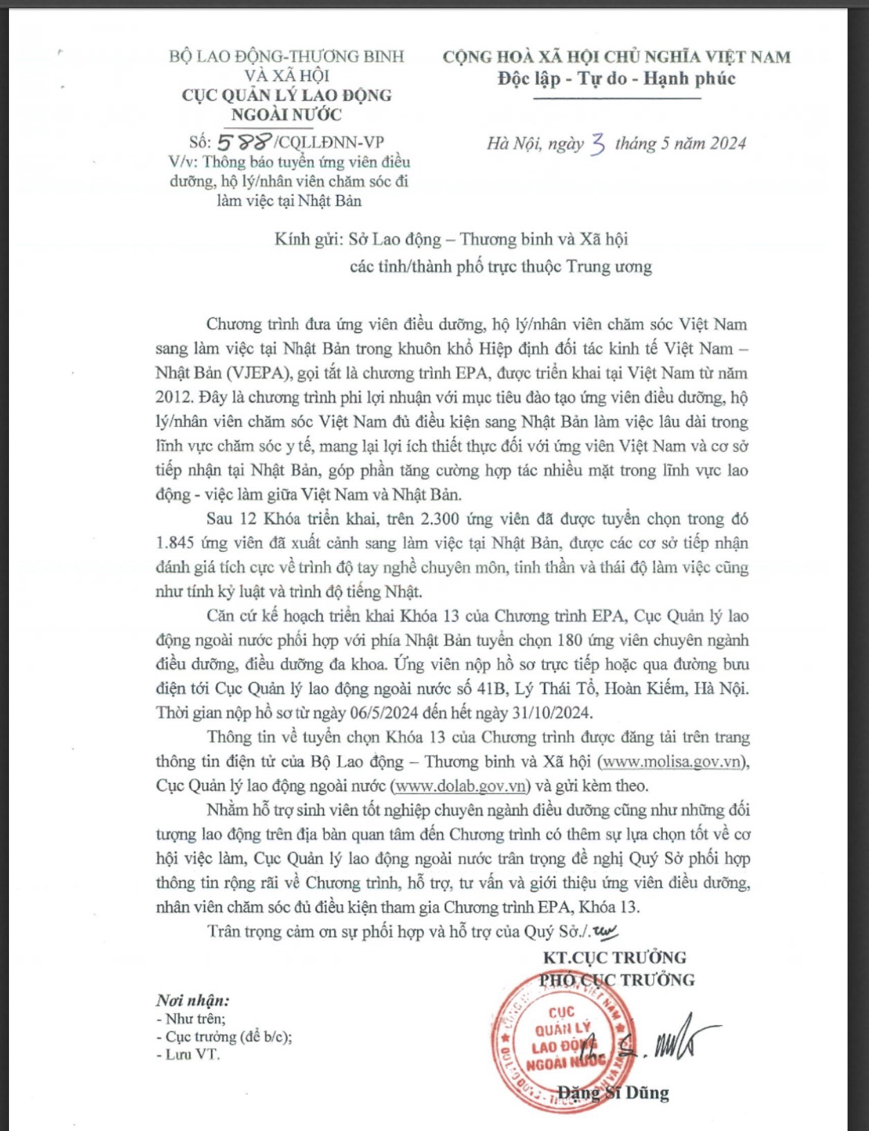 Căn cứ Kế hoạch triển khai khoá 13 của chương trình EAP. Cục Quản lý lao động ngoài nước phối hợp với phía Nhật Bản tuyển dụng 180 ứng viên chuyên ngành điều dưỡng, điều dưỡng đa khoa.