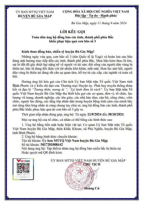 Uỷ ban MTTQ VN huyện Bù Gia Mập kêu gọi ủng hộ đồng bào các tỉnh phía Bắc khắc phục hậu quả sau cơn bão số 3